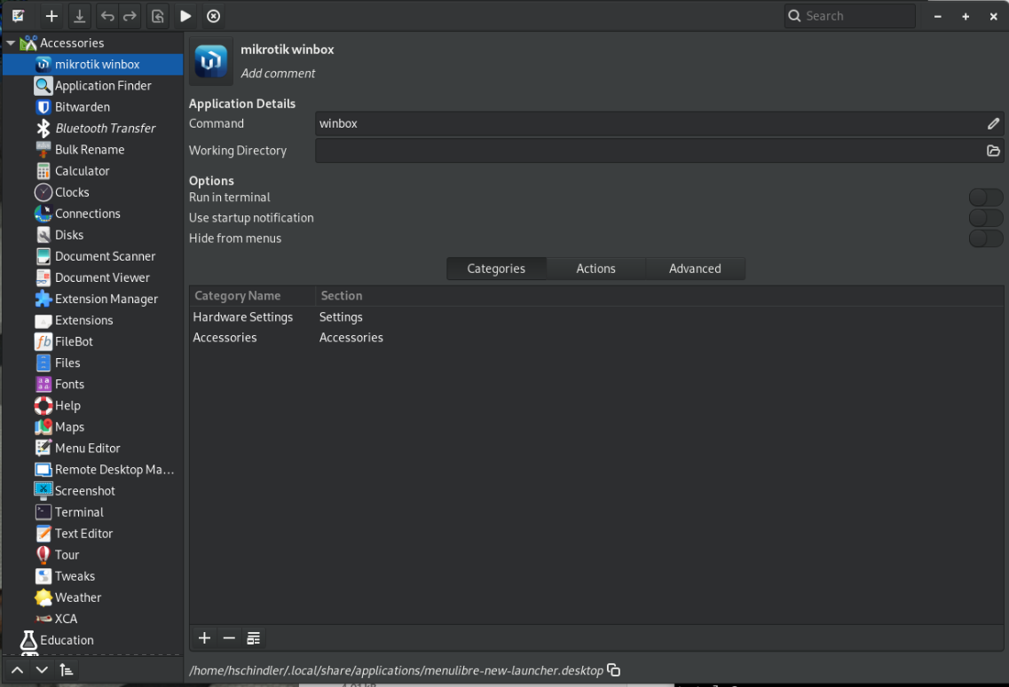 Download the application from Mikrotik download page. Extract the package to ~/bin. Copy the icon file from the assets/img directory to ~/icons.